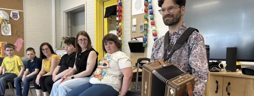 Philippe Jetté a réalisé 50 ateliers dans les huit écoles primaires de Sept-Îles en janvier et mai 2025. Son rôle d’artiste à l’école lui a permis de sensibiliser plus de 1 500 élèves à l’importance de cultiver nos traditions culturelles et de partager des danses, des chansons à répondre, des comptines et notre musique traditionnelle pour leur continuité. Une belle collaboration avec le Centre de services scolaire du Fer !