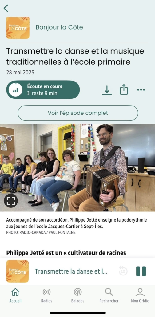 Radio-Canada a réalisé un magnifique reportage avec Philippe Jetté et les élèves de Sept-Îles sur la transmission de la danse et la musique traditionnelles à l’école primaire. Le journaliste a interviewé les enfants sur l’heure du midi. Ce qui ajoute un charme au reportage.